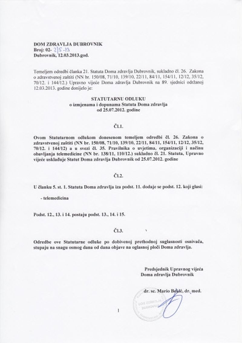 - 08.07.2013. Statutarna odluka o izmjeni i dopuni Statuta Doma zdravlja Dubrovnik
