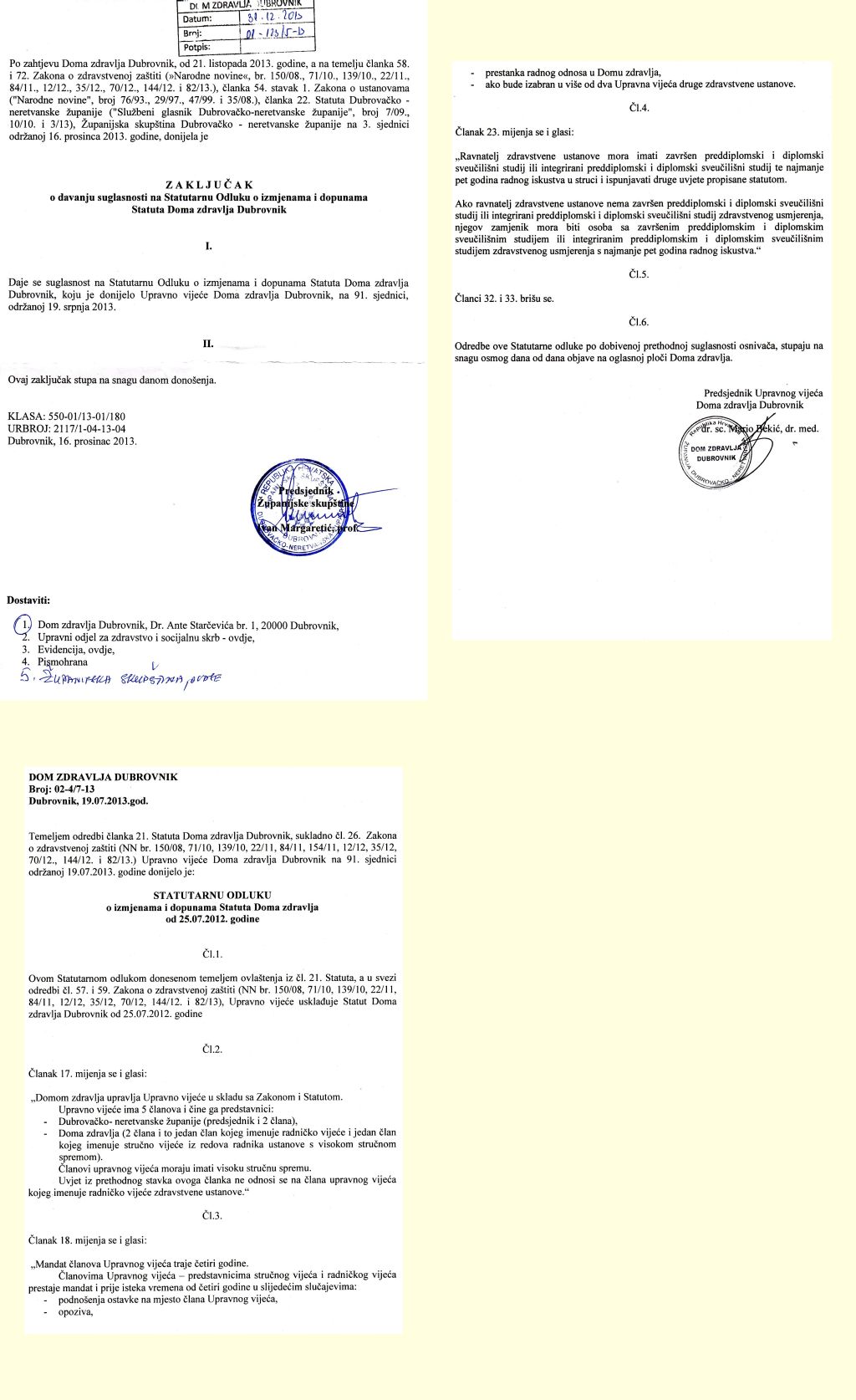 - 08.07.2013. Statutarna odluka o izmjeni i dopuni Statuta Doma zdravlja Dubrovnik